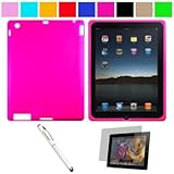 Premium Rubberized Protective Soft Silicone Skin Cover Case for Verizon Wireless New Apple iPad 2 (16GB, 32GB 64GB) 2nd Generation and AT&T Apple iPad 2nd Generation iPad 2 Wireless Tablet + Anti-Glare Clear Screen Protector for Apple iPad 2 Tablet + Executive White Stylus Pen with Laser Pointer and LED Light Compatible with Apple iPad 2, Hot Pink